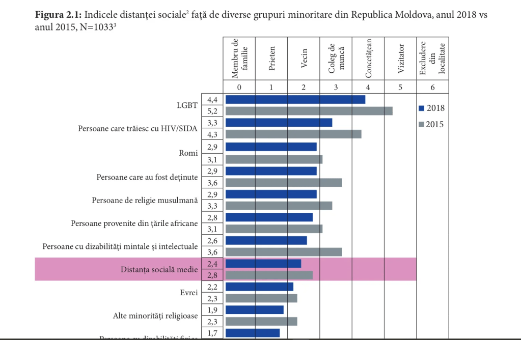 „Opracowaliśmy współczynnik SDI [Social Distance Index – przyp. red.], za pomocą którego odmierzamy stopień niechęci ogółu społeczeństwa do badanych mniejszości. W pierwszym badaniu z 2015 roku osoby LGBT otrzymały wynik pomiędzy pięć a sześć w skali, w której piątka to dopuszczenie krótkotrwałego pobytu na terenie kraju – chociażby w formie turystyki – zaś szóstka to wygnanie z Mołdawii. Była to wówczas najgorzej postrzegana z badanych mniejszości”.